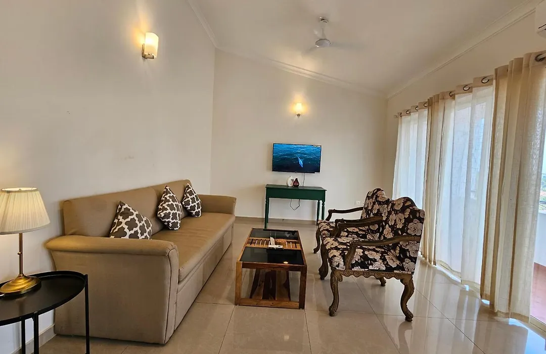 El Serene 2Bhk Porvorim Apartment With Forest View & Pool Access cuenta con un cuarto de estar, un balcón y una cocina, y comodidades como climatizador y una lavadora.